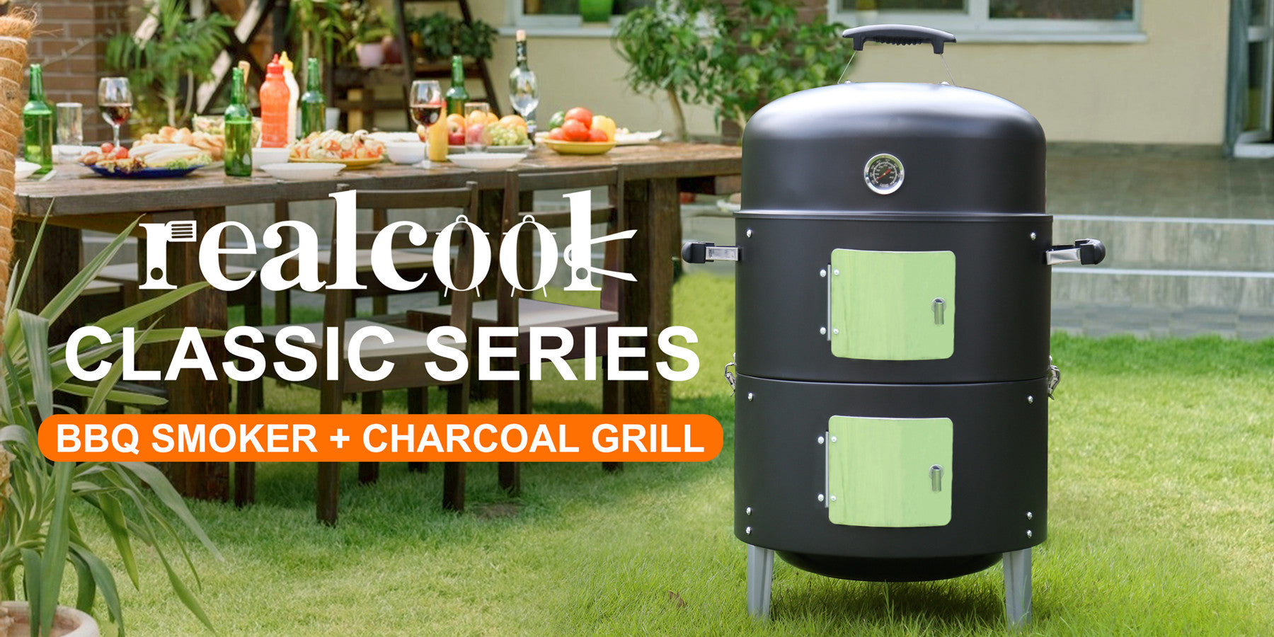 Realcook Charcoal BBQ Smoker Grill - 20 Inch Vertical Smoker for Outdoor Cooking Grilling