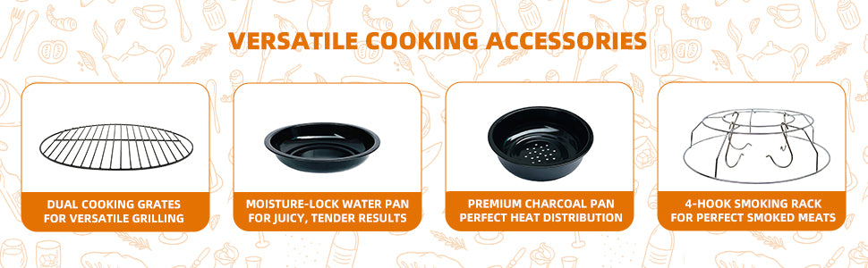 - Built to Last: Constructed with durable porcelain-enameled coating, our charcoal smoker withstands high temperatures while preventing rust and wear. The robust build ensures stable use over time, making it an ideal choice for outdoor smokers who value longevity and durability in their cooking equipment