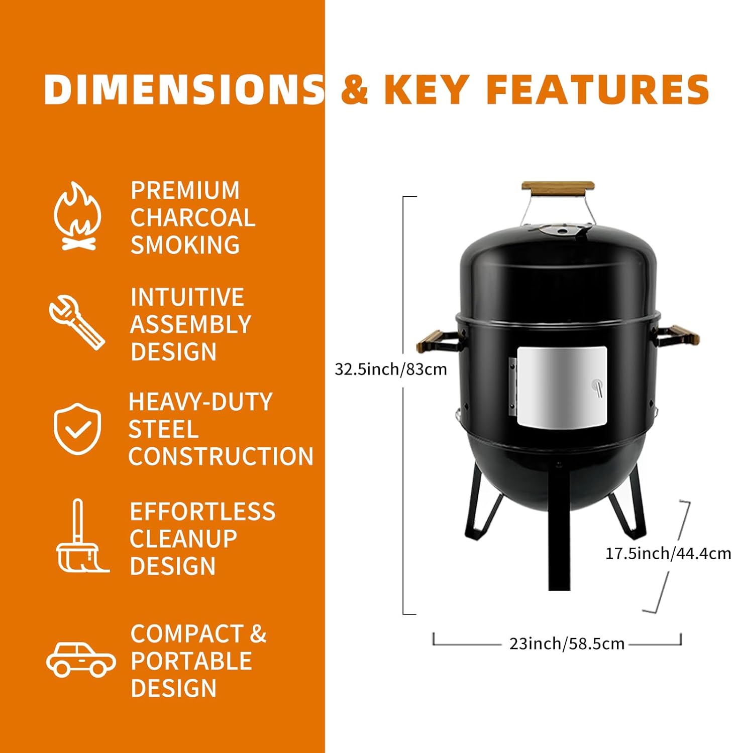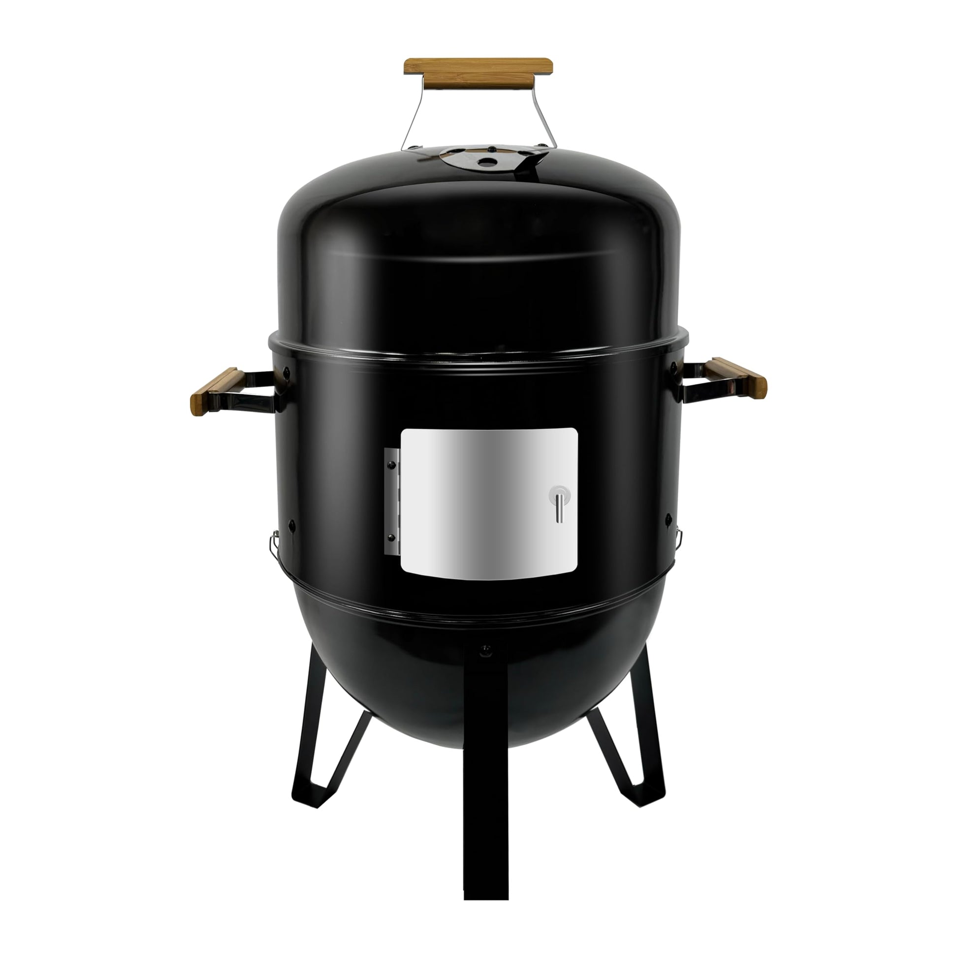 - Convenient Features for Easy Handling: Equipped with heat-resistant wood handles and a latch locking system, our outdoor smoker is designed for ease of transport and handling. Whether you're moving it to the backyard or taking it apart for cleaning, these features make your grill smoker user-friendly and accessible