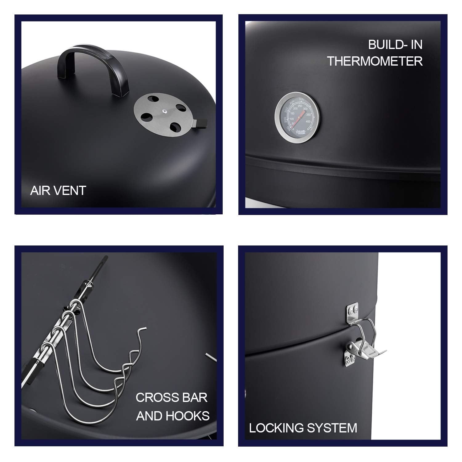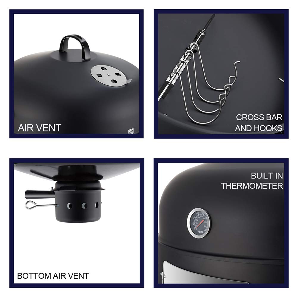 - 【COOKING SPACE】 - 2 pieces cooking grids provide total 453 square inches cooking space. With crossbar and 4 hangers inside the lid, you can smoke different sizes and shapes of meat.